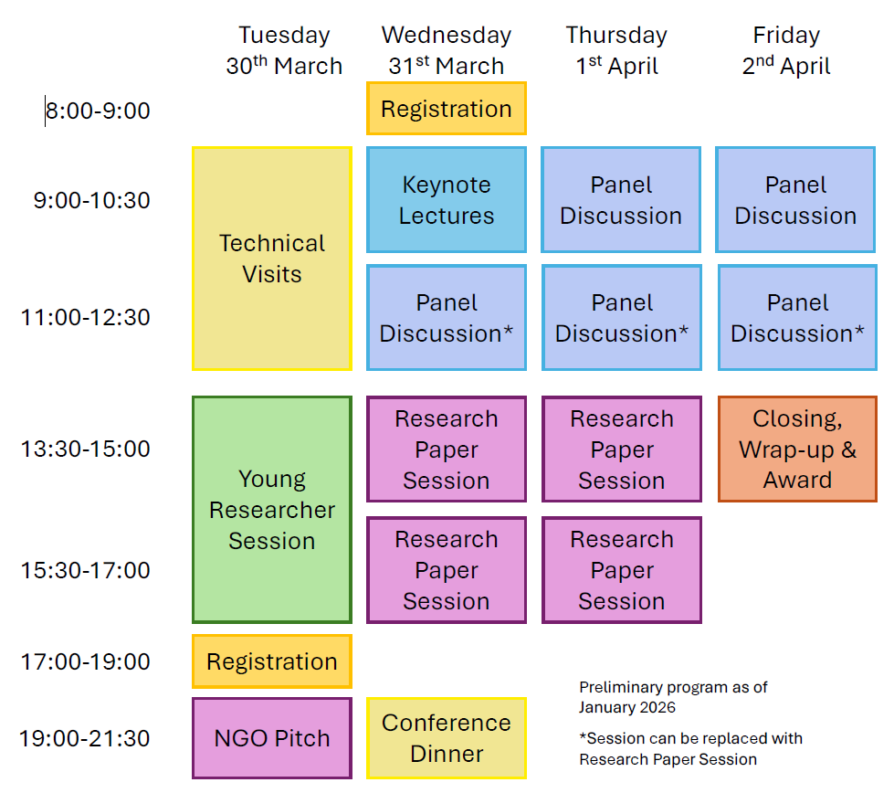 WSSTL 2027 features plenary sessions and a series of panel discussions and sessions where research papers are presented and discussed. On the first day, technical visits and special sessions for young researchers will be held, followed by registration, welcome reception and NGO pitches.